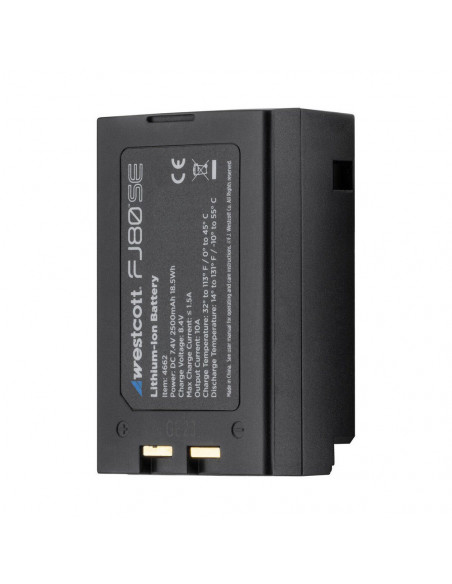 Rechargeable battery for FJ80 SE flashes The Westcott FJ80 SE Lithium Ion Battery is a removable 18.5Wh 2500mAh lithium ion battery for the FJ80 SE Speedlight delivers 550+ full power flashes on a single charge and provides DC power for freedom on location. The battery fully charges in â¤3 hours and can be recharged more than 200 times. Highlights Compact and lightweight at 0.11 kg DC 7.4V 2500mAh 18.5Wh lithium ion battery Delivers 550+ full power flashes per charge Fast charging time of ⤠3 hours 200+ battery charge cycles , Battery Flashes per Charge: 550+ @Full Power Battery Type: Lithium ion Battery Capacity: 18.5 Wh, 2500mAh Battery Voltage: 7.4V Charge Power: 12.6V @1A Battery Removable: Yes Charge Time: â¤3 Hours Charge Cycles: 200+ (@80% after 200) Charging Temperature: 32° to 113°F (0° to 45°C) Discharge Temperature: 14° 131°F ( 10° 55°C) Watt hours: 18.5 Wh Electrical Amps: 10A Voltage: 7.4V Input Power: 100 240V 50 60Hz 0.5A Battery Type: Lithium ion Battery Mount: FJ80 SE Cooling: Passive Operating Temp.: 14° 104°F ( 10° 40°C) Power Cooling: Passive Certifications: CE, RoHS USB Capability: CE General Dimensions: 6.9 à 4.4 à 2.4 cm Weight: 0.1 kg Materials: Plastic, Electronic Components , Westcott FJ80 SE Lithium Ion Battery