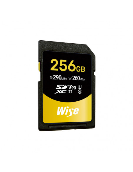 The essence of memory cards The small but mighty Wise SDXC⢠UHS II V60 and V90 editions are seamlessly compatible with professional camcorders, mirrorless and cinema cameras. The Wise 256GB SDXC UHS II V90 Memory Card is for professional makers who demand reliable and durable media they can trust without compromise. Highlights Compatible with professional camcorders, mirrorless and cinema cameras V90 class for breathtaking 8K recording Speed of up to 290 MB/s read and 2760 MB/s write Non stop recording time Speed up to 290MB/s read and 2760MB/s write For designers, efficiency counts. Wise SDXC⢠UHS II cards stand up to the toughest demands for photos and video. Reads up to 290 MB/s optimise your post production workflow and writes up to 260 MB/s enable you to handle burst shooting modes and high quality video recording with ease. V90 class for breathtaking 8K recording With the most innovative video speed class, the V90 standard, Wise SDXC⢠UHS II cards are the most reliable tools for 8K, 3D and 360 degree video and image recording. It guarantees a minimum write speed of at least 90 MB/s without dropped frames. Non stop recording time The large capacity, up to 512 GB, provides enough space for uninterrupted pristine shooting. Filmmakers can now shoot for longer without frequent card changes. Ultimate durability The Wise Advanced SDXC⢠UHS II cards are water, dust, shock, X ray and stress resistant. They can be used in temperatures from 13ËF to 185ËF ( 25ËC to 85ËC). , Model: SD N256 Capacity: 256GB Video speed class: V90 Max. read: 290 MB/s Max. write 260 MB/s Min. sustained write: 90 MB/s Form Factor: SDXC Interface: UHS II NAND Flash: pSLC Dimensions: 24 x 32 x 2.1 mm Weight: 2 g Operating temperature: 25ËC to 85ËC Storage temperature: 40ËC to 85ËC 2 year warranty ,For compatibility use this link