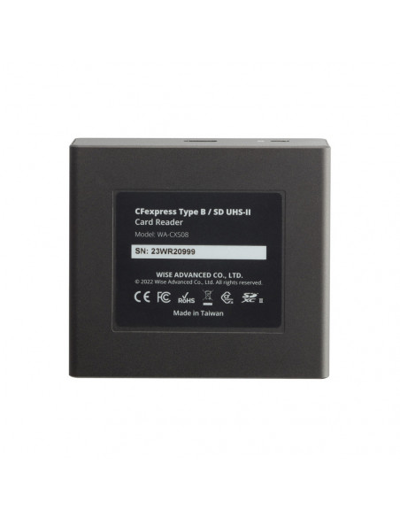 Leading card readers Wise Advanced offers the leading card readers to match high performance recording media. The Wise CFexpress Type B / SD UHS II Card Reader with its USB4 interface, data transfer rates of up to 10 Gb/s are no longer a fairy tale. Highlights Read speeds of up to 10 Gb/s USB4 interface Sturdy and durable material Up to 10 Gb/s read speed Lightning fast data transfer lets you spend more time creating and less time waiting. Solid and durable material Aluminium Card Reader is one of the best metals for heat dissipation as it is a good conductor of heat. , Model: WA CXS08 Maximum read: 10 Gbps Media type: CFexpress type B/SD Interface: USB 3.2 Gen 2 Port: USB Type C Dimensions: 69.8 x 62 x 21 mm Weight: 89 g 2 year warranty